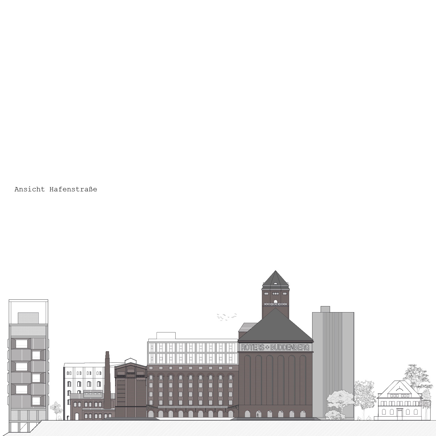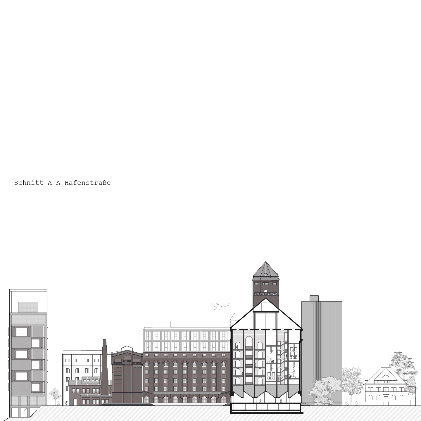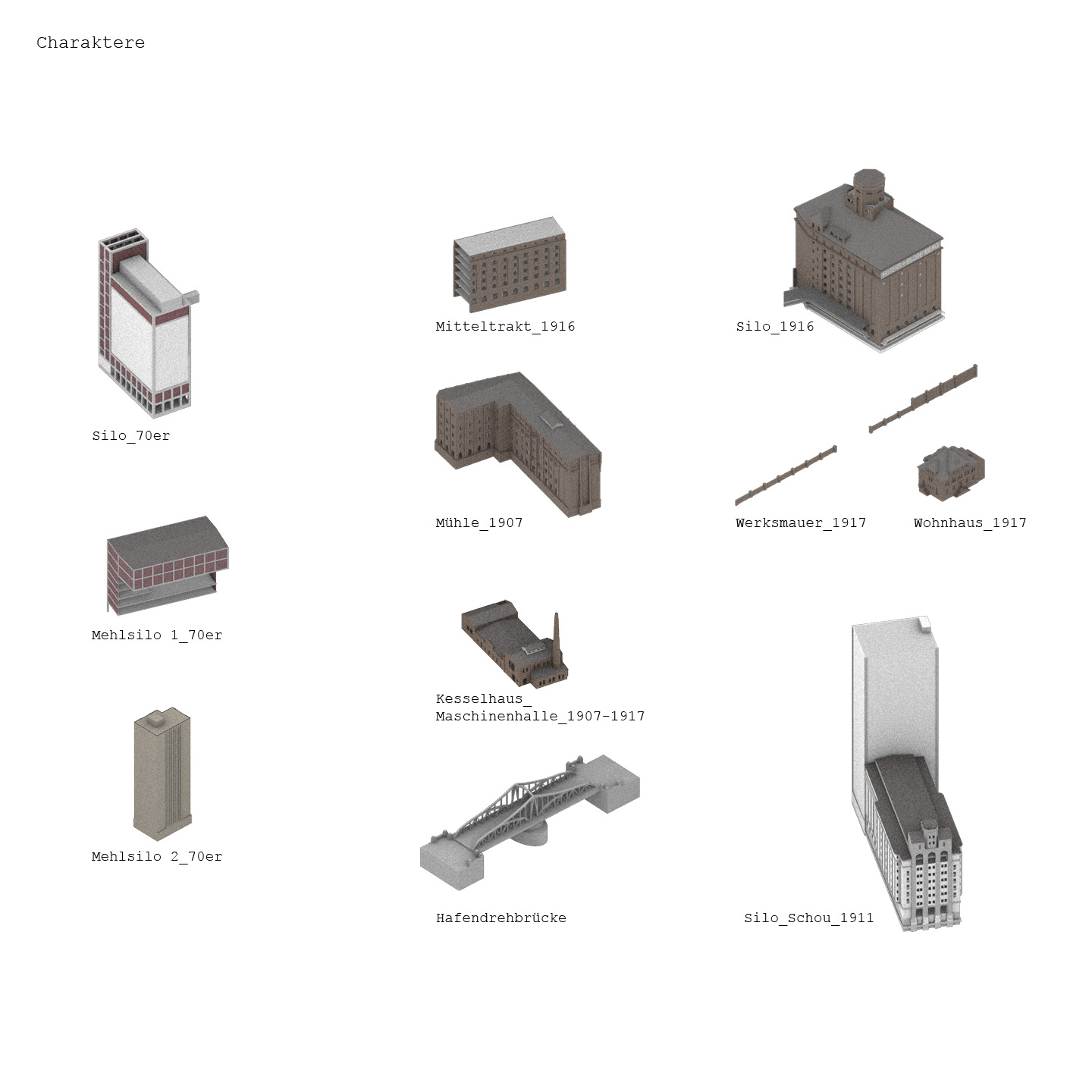 Der Komplex besteht aus mehreren Gebäudeteilen rund um die historische Hafendrehbrücke und ist nicht als einzelnes Gebäude zu verstehen. Zunächst wurden die unterschiedlichen Teile als individuelle Charaktere erfasst und katalogisiert. Der Fokus und die Entwurfs- Vertiefung konzentrieren sich jedoch auf den Silobau von 1916, der durch seine Form und Typologie ein repräsentativer Vertreter der „SiloStadt“ ist. Dank der erhaltenen historischen Silozellen und des geringen Substanzverlusts kann dieses Gebäude als „Leuchtturm“ der „SiloStadt“ betrachtet werden.