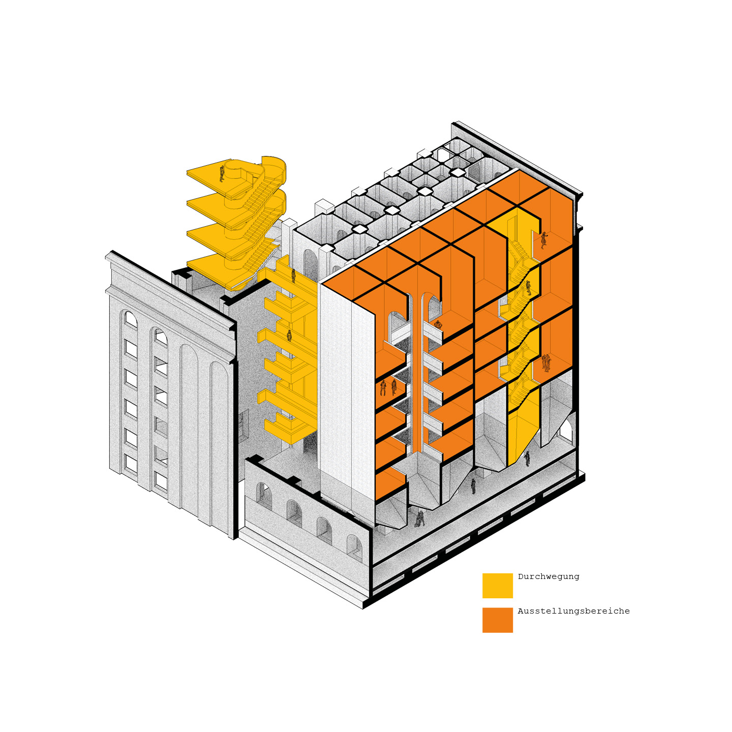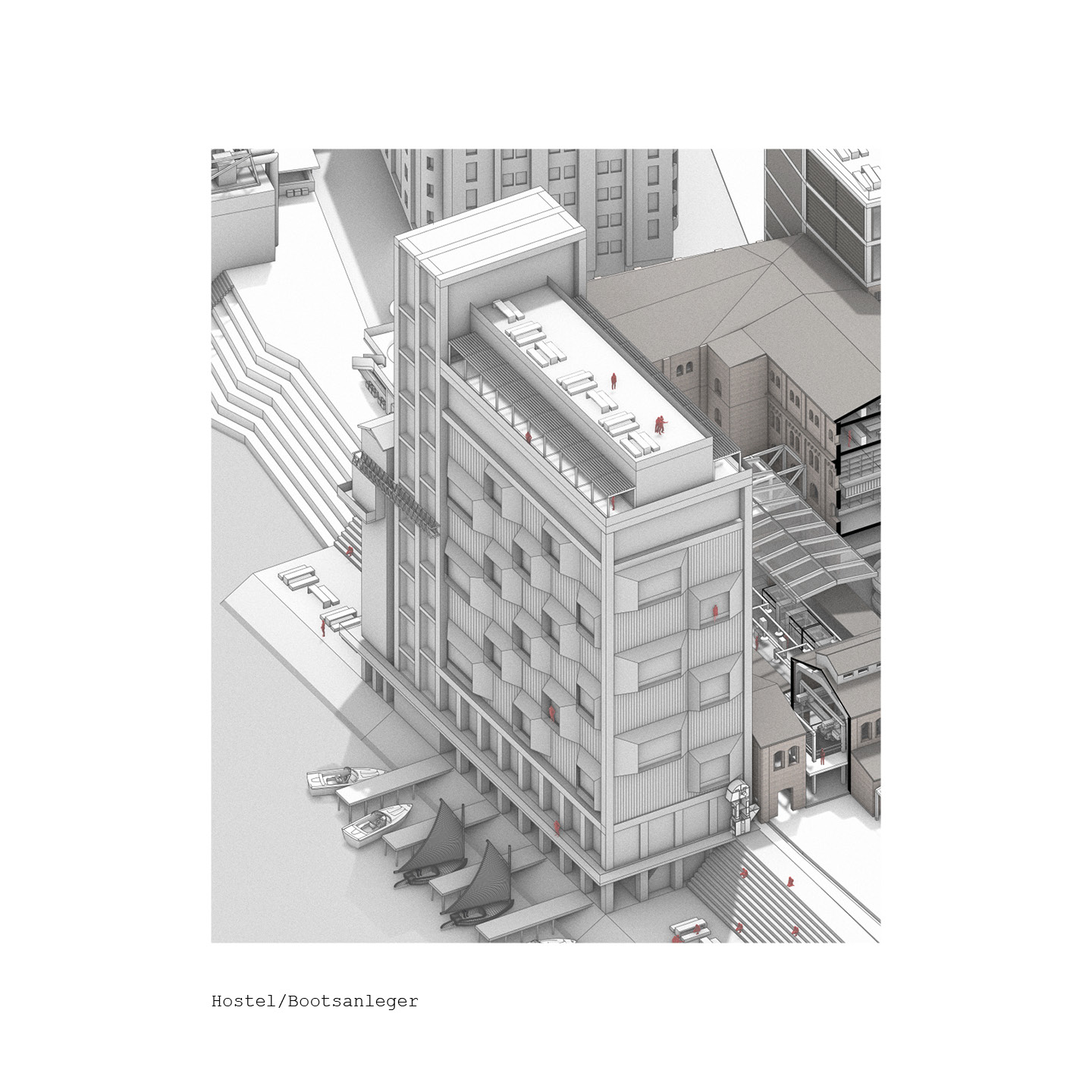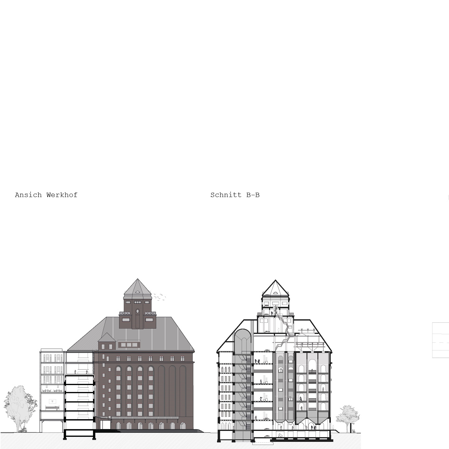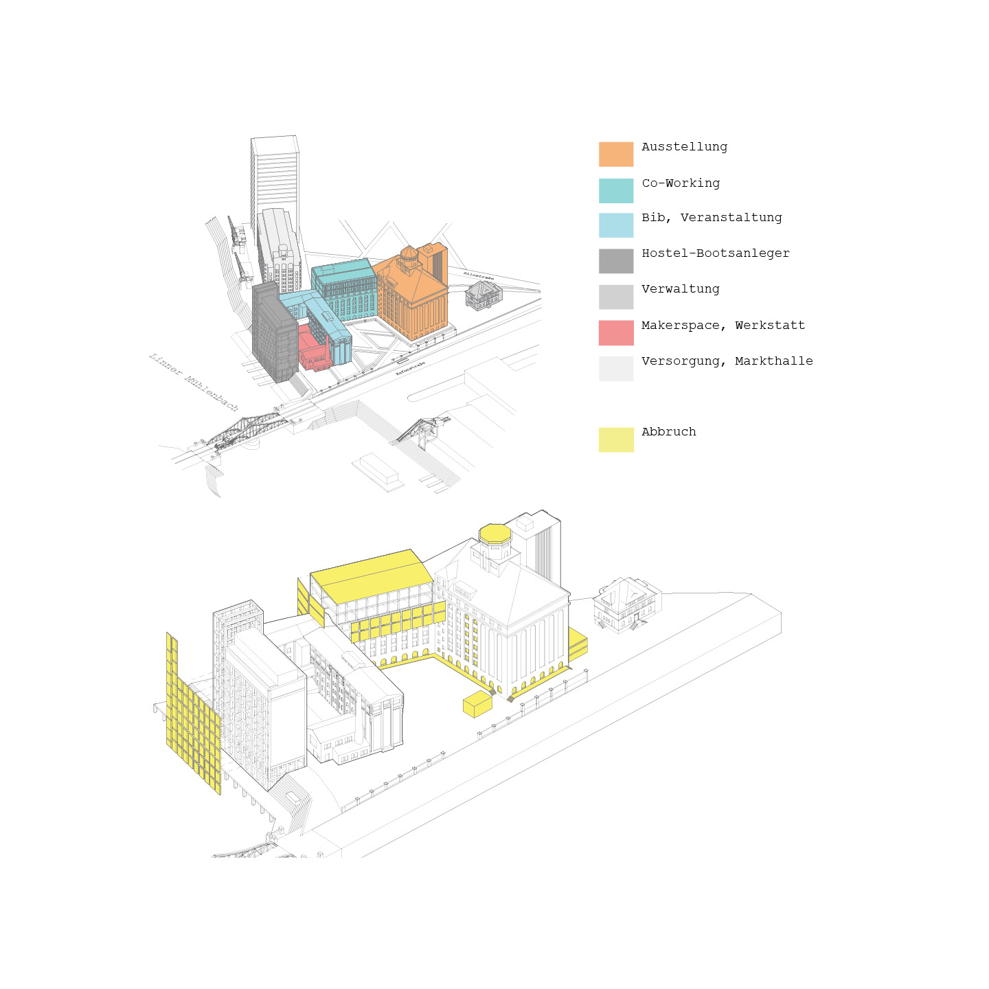 Der Komplex besteht aus mehreren Gebäudeteilen rund um die historische Hafendrehbrücke und ist nicht als einzelnes Gebäude zu verstehen. Zunächst wurden die unterschiedlichen Teile als individuelle Charaktere erfasst und katalogisiert. Der Fokus und die Entwurfs- Vertiefung konzentrieren sich jedoch auf den Silobau von 1916, der durch seine Form und Typologie ein repräsentativer Vertreter der „SiloStadt“ ist. Dank der erhaltenen historischen Silozellen und des geringen Substanzverlusts kann dieses Gebäude als „Leuchtturm“ der „SiloStadt“ betrachtet werden.