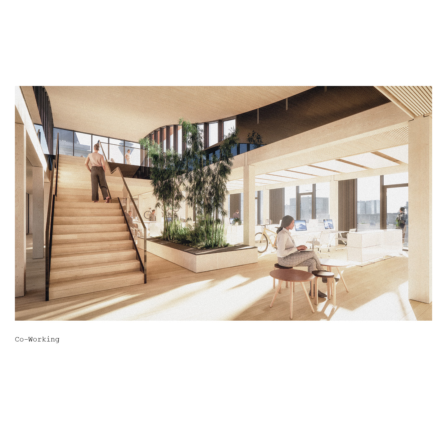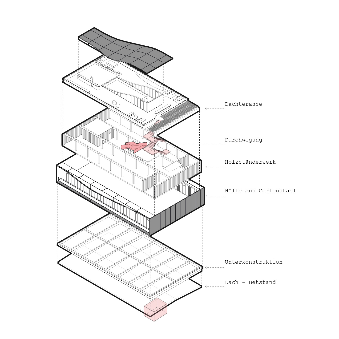 Die Einfügung in den Gesamtkontext des Hafenensembles entlang der Speditionsstraße bestimmt die Materialwahl der Gebäudehülle. Die Bekleidung aus Cortenstahl fügt sich harmonisch in den Bestand und die umliegenden Ziegelbauten ein und reflektiert den industriellen Ursprung des Ortes. Die metallische Hülle der Aufstockung verleiht dem Gebäude einen präzisen, scharfkantigen Charakter und ermöglicht gleichzeitig die geschwungene Wellenform. Die Konstruktion besteht aus vorgefertigten Massivholzteilen, wodurch die Erweiterung in kürzester Zeit auf den Bestand montiert werden kann. Dies minimiert den Bedarf an Baustelleneinrichtungen, was den Gegebenheiten vor Ort entgegenkommt. Das Projekt bleibt vollständig demontierbar und nachhaltig. Neben den funktionalen Aspekten entsteht so eine Bürofläche mit hohem emotionalen Wert und optimalem Arbeitsklima.