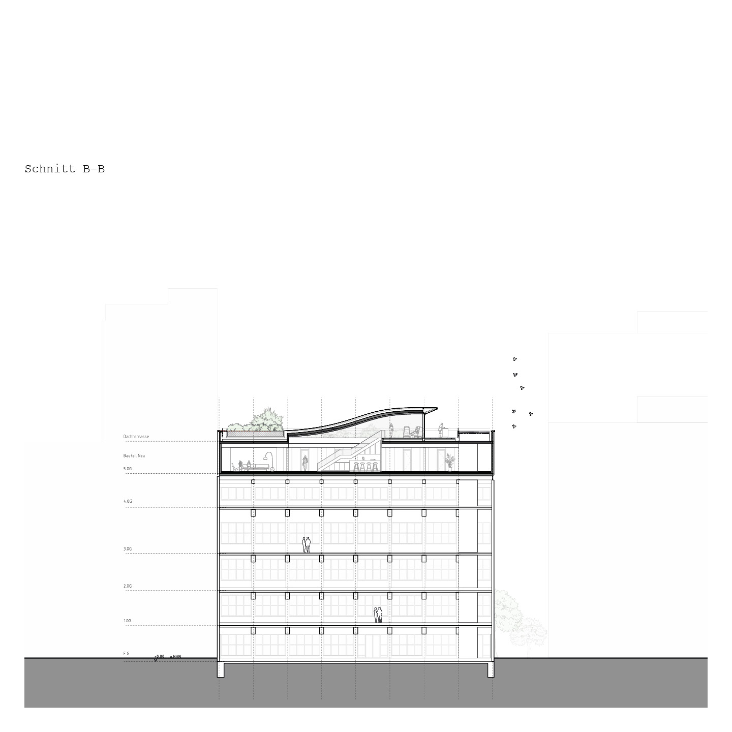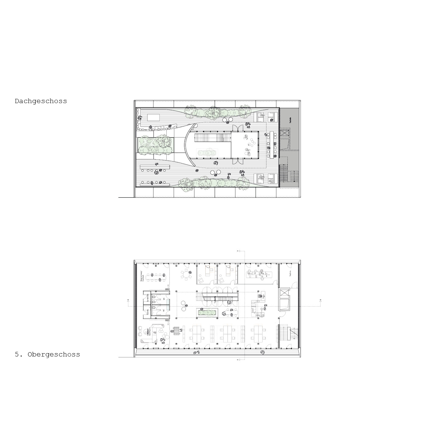 Zentrales Element des Grundrisses ist eine großzügige Treppe, die die Büro- und Showroomfläche mit der Dachterrasse verbindet. Diese zweite Ebene der Aufstockung bietet vielfältige Nutzungsmöglichkeiten unter freiem Himmel: Arbeiten, Entspannen, Feiern. Die Wellenform des Dachaufbaus setzt die Bewegung der Treppe nach außen hin sichtbar fort.