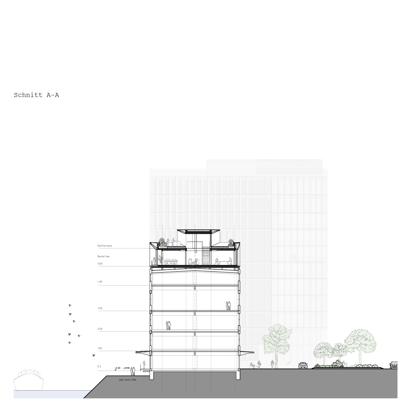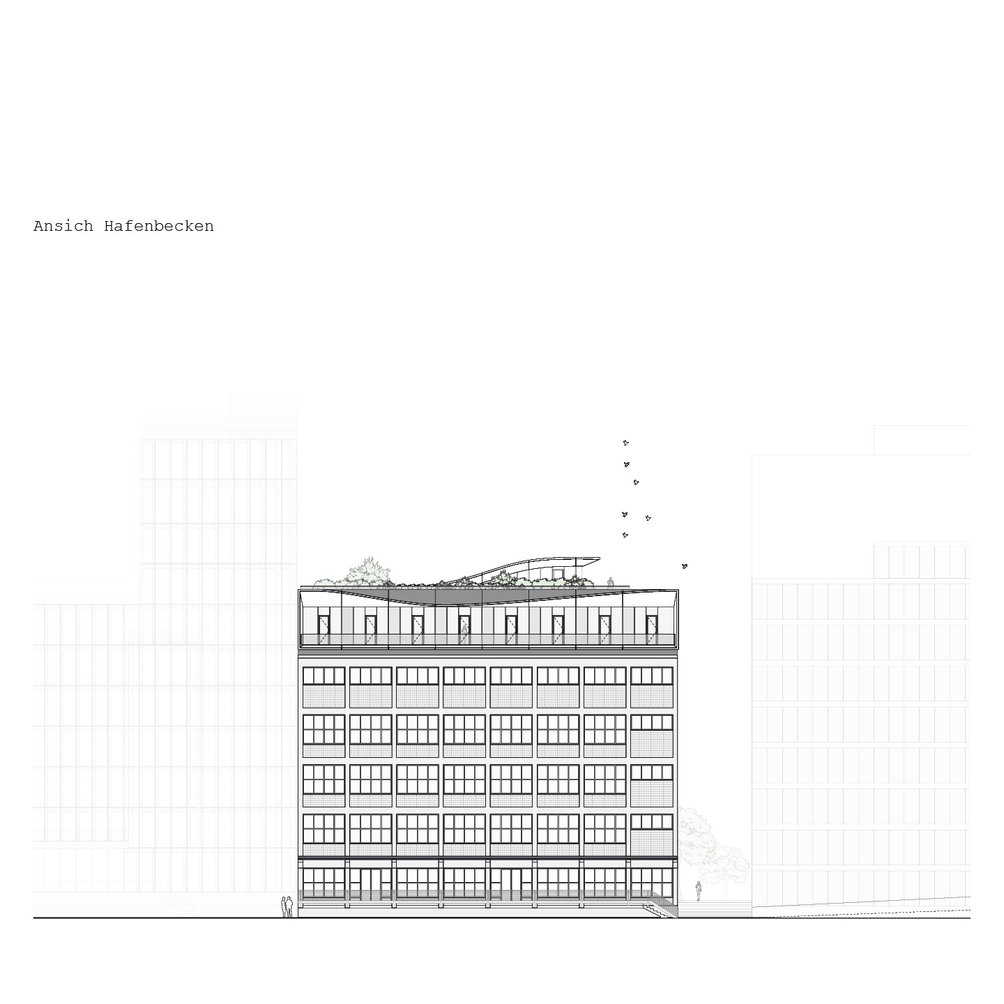 Der Entwurf leitet sich aus dem strengen Raster des funktionalen Bestandsgebäudes ab und verfolgt das Ziel, die Erweiterung modular und leicht industriell wirken zu lassen. Dieser Baukörper übernimmt die Struktur und Abmessungen des Bestands, löst sich jedoch leicht schwebend von der bestehenden Dachhaut ab und betont seine Eigenständigkeit. Konstruktion, Ausbau und Fassade können einfach maschinell vorgefertigt und wirtschaftlich errichtet werden. Nach außen zeigt der Entwurf seine Individualität. Die um fünf Meter in den Luftraum geschobene Fassadenbox eröffnet den Blick auf das Wasser und zur Altstadt. Die obere Kante der Fassade schwingt in einer unverwechselbaren Wellenform und betont die Besonderheit des Ortes. Zusätzliche Photovoltaikelemente sorgen für eine nahezu autarke Energieversorgung.